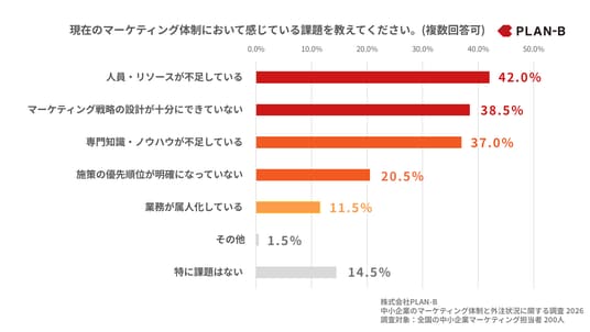 本調査から、中小企業のマーケティングにおいては、「人員・リソース不足」に加え、「戦略設計」や「専門知識の不足」といった課題が同時に存在していることが明らかになりました。