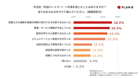 ・外注先への不満は「提案内容の実行可能性の低さ(26.0%)」「事業理解不足(24.5%)」が上位