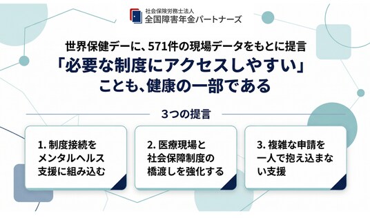 うつ病特化の障害年金申請支援専門として2,500名超の支援実績を持つ、社会保険労務士法人 全国障害年金パートナーズ(東京都千代田区、代表:宮里竹識)は、2026年4月7日の世界保健デーにあたり、支援現場から得た571件のデータをもとに提言を発表します。
