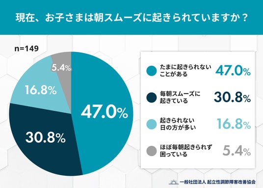 進級・進学による環境変化が大きい新年度。生活リズムの変動に不安を感じる保護者が多い中、一般社団法人 起立性調節障害改善協会は、小学校高学年~高校生の子どもを持つ保護者149名を対象に「新学期の登校時間と朝の起床に関する実態調査」を実施しました。その結果、約7割の子どもが「朝スムーズに起きられない」という課題を抱えており、保護者の約3人に1人が新年度の生活に対して不安を感じている実態が浮き彫りになりました。特に、朝のトラブルへの対策として「医療機関への相談」を検討する家庭はわずか2%に留まり、背景にある身体疾患「起立性調節障害(OD)」の可能性が見過ごされやすい現状が明らかになりました。