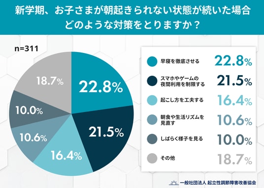 - 「朝起きられない」への対策は「早寝の徹底(22.8%)」が最多。一方で「受診」を考える人はわずか1.9%