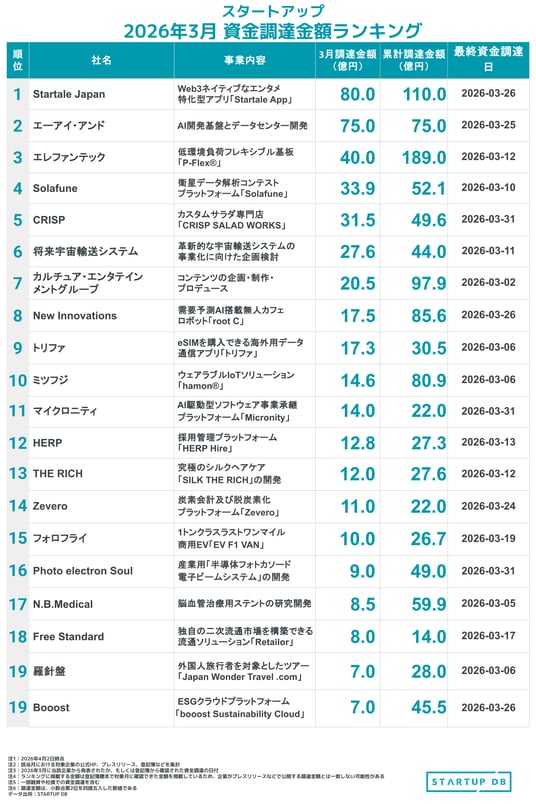 ・タイトル:「スタートアップ資金調達金額ランキング」・調査期間:2026年3月1日~3月31日まで(2026年4月2日時点)