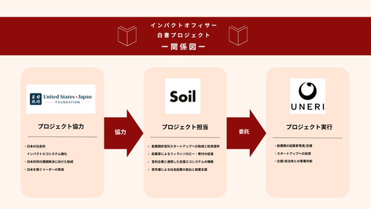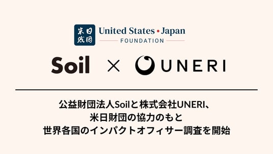 社会課題解決型スタートアップのエコシステム構築を行う株式会社UNERI(本社:愛知県名古屋市、代表取締役:河合 将樹、以下「UNERI」)は、公益財団法人Soilによる「インパクトオフィサー白書」の創刊に向けた実態調査および制作プロジェクトを担当いたします。本プロジェクトには米日財団からSoilへの資金助成が決定しております。