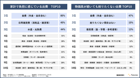 家計の負担感は「食費(85%)」が突出。一方、「最も削りたくない項目」でも食費が首位となり、生活の質は維持したいという強い葛藤が判明。