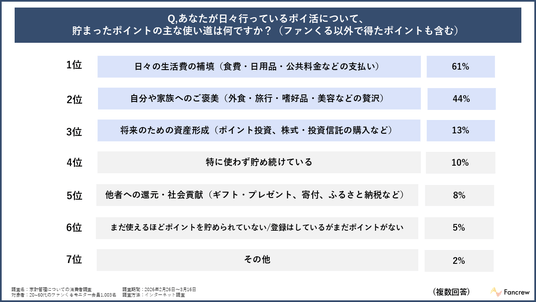 今回の調査では、家計の不足分を補うための対策として、1位の「生活費の節約」とほぼ並ぶ形で「ポイ活」が挙がりました。「ポイ活」で獲得したポイントの使い道は「日々の生活費の補填(食費・日用品・公共料金などの支払い)」が61%でした。支出の最適化に積極的な層において、ポイントを生活費へ戦略的に充当し、生活の質を賢く維持している傾向が見受けられます。