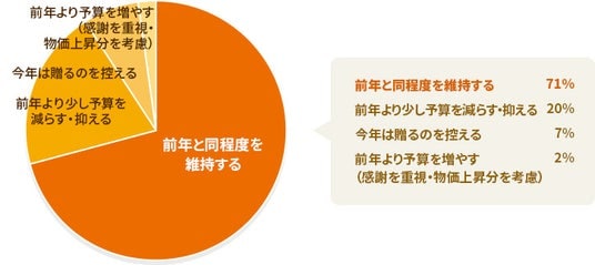 「物価高を受けて、今年の母の日ギフトの予算はどうする予定ですか?」という設問に対し、「前年と同程度の予算を維持する」との回答が71%に達しました。大切な人への贈り物は欠かせないと考える人が大半であることがわかりました。