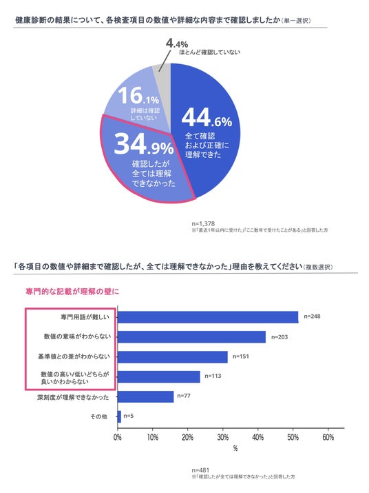 【健診結果を確認しても約35%が「理解できない」、20%は確認すらしていない。「理解できない」最大の原因は「数値の意味がわからない」。専門的な記載が理解の壁に】