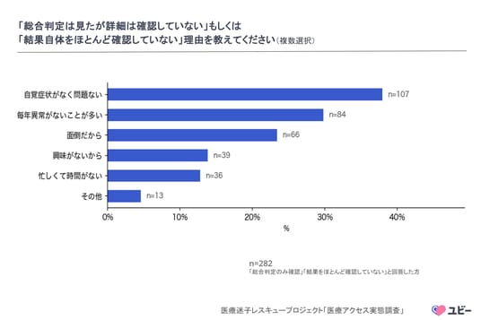 また、結果を十分に確認しなかった理由としては、「自覚症状がなく問題ないと思っているから」(37.9%)が最多で、「毎年受けていて異常がないことが多いから」(29.8%)、「面倒だから」(23.4%)と続きました。自覚症状がないことへの安心感や、毎年健診を受診するという行為に満足し、その結果を活用することが目的であるはずが、結果の”置き去り"を生む一因となっていることがうかがえる回答となりました。