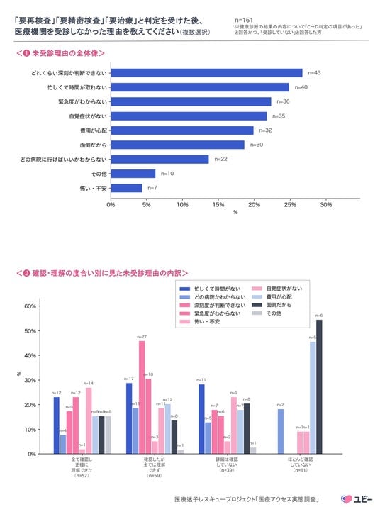 医師として診療にあたる中で、健診で異常を指摘されていたものの受診のタイミングをつかめないまま、症状が進行してから来院される方を少なからず目にしてきました。今回の調査結果で特に注目すべきは、未受診の背景が「忙しくて時間がない」という外的制約だけでなく、「深刻度がわからない」「面倒」といった、理解不足や心理的障壁にも大きく関連している点です。受診行動を妨げる要因が従来想定とは異なるケースがあり、受診勧奨のあり方を考えるうえでも重要な視点です。