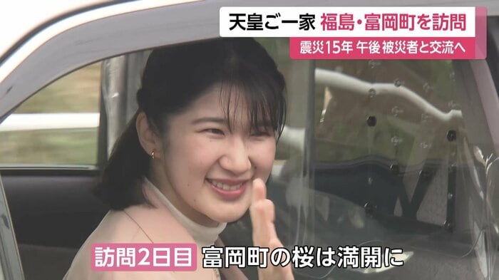 福島訪問2日目、ご一家は、7日に満開を迎えた桜並木を通り、地元の人たちに笑顔で手を振って富岡町を訪れた。