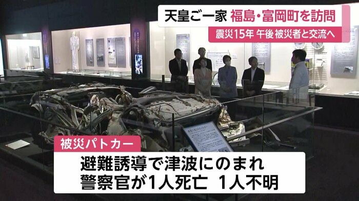 避難誘導にあたり津波にのまれ、乗っていた警察官の1人は死亡し、もう1人は行方不明となっているパトカーなど震災遺産を見学したご一家は、激しく損傷した車体を見つめ、皇后さまは「痛ましいですね」と述べられた。