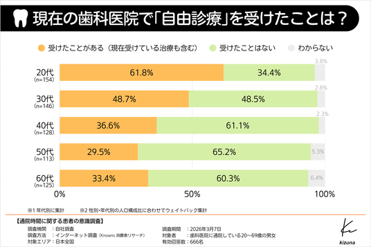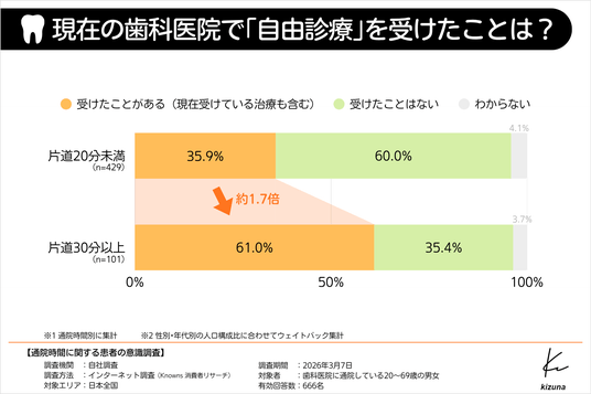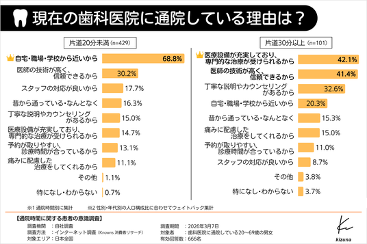 そこで、患者さまとの対話を重視し、予防歯科から審美治療まで幅広い歯科医療を提供する『医療法人きずな きずな歯科クリニック』( https://www.kizna-dc.com/ )(所在地:兵庫県神戸市北区、院長:水野貴文)は、通院にかけている時間と歯科医院選びの関係を把握するため、全国の20~69歳の男女666名を対象に調査を実施しました。