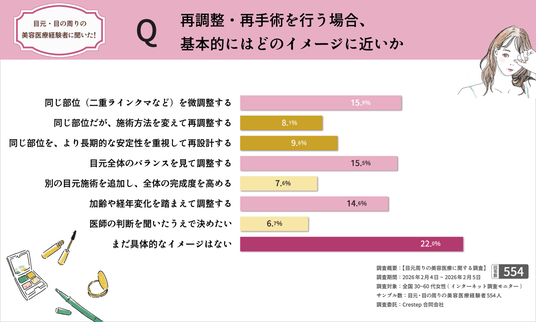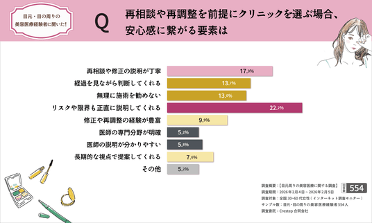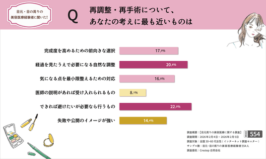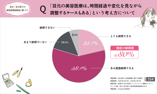 目元・目の周りの美容医療経験者554名を対象に、施術前の不安・施術後の満足度・再相談(再調整)意向を調査。