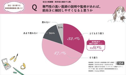 調査名:【目元周りの美容医療に関する調査】調査期間:2026年2月4日~2026年2月5日調査対象:全国/30~60代/女性(インターネット調査モニター)有効回答数:目元・目の周りの美容医療経験者554人調査実施:Crestep合同会社