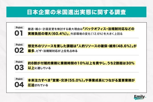 COEL, Inc.(本社:米国カリフォルニア州、CEO:松尾裕介)が提供するオンラインアシスタントサービス「Emily.アシスタント」は、米国事業に携わった経験のある日本企業の経営者、役員、事業責任者、担当者111名を対象に、米国進出の実態に関する調査を実施しました。