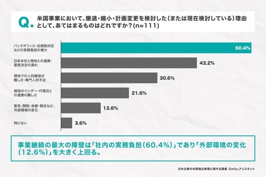 今回の調査で最も注目すべきは、米国事業からの撤退・縮小・計画変更を検討する理由として「バックオフィス・法規制対応などの実務負担の増大」が最多となり、「外部環境の変化」を大きく上回ったことです。これは、米国進出の成否が、市場環境や競合状況といった外部要因よりも、むしろ社内の実務運営体制という内部要因に大きく左右されることを示しています。