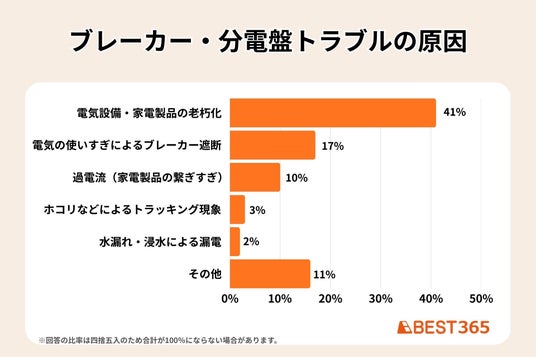 電気トラブルは実際にどこで最も頻繁に起きるのか、想定では使用頻度が高く、生活環境に露出している「コンセント・電気タップ」でしたが、アンケート結果で一番多いのは「ブレーカー・分電盤」でした。