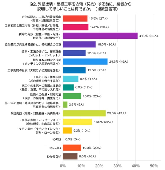 - 「工事範囲と施工内容(外壁/屋根/付帯部、下地補修の有無など)」は14.0%(28人)、「劣化状況と、工事が必要な理由(写真・診断結果など)」は13.5%(27人)でした。どこをどこまで工事するのか、なぜ必要なのかは、専門知識がないと判断しにくい部分です。言葉だけでなく、写真や診断結果を見ながら説明してほしいと感じる場面も多そうです。