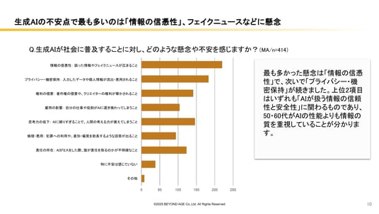 生成AIが社会に普及することに対する懸念を尋ねたところ、最も多かったのは「情報の信憑性:誤った情報やフェイクニュースが広まること」で、次いで「プライバシー・機密保持:入力したデータや個人情報が流出・悪用されること」が続きました。