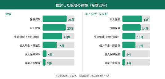 30~40代に絞ると、がん保険(15件)・医療保険(14件)が拮抗しており、若いうちからがんや病気への備えを意識する層が増えていることがうかがえます。