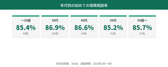 30代(86.9%)・40代(86.6%)・50代(85.2%)・20代以下(85.4%)・60代以上(85.7%)と、年代を問わず約86%が「初めての保険相談」であったことが示されました。