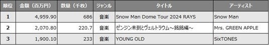 1. Snow Manが音楽・映像ソフト売上で2冠 トータル金額は203.9億円