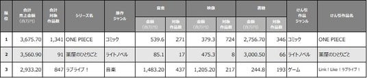 シリーズ作品別総売上金額ランキング(※6)では、『ONE PIECE』が2年ぶりに1位となりました。総売上は36.8億円となり、前年の4位から順位を上げました。コミック売上金額では、『ONE PIECE』111巻(7.9億円)、112巻(7.1億円)、113巻(5.7億円)がTOP3を独占。『ONE PIECE』シリーズ売上の約75%をコミックが占めました。(※6) 映画・ドラマ・アニメ・コミック・小説・ゲームなどを原作とするシリーズ作品の映像・音楽ソフトや書籍の売上を合算