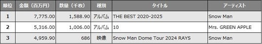 1. Snow Manが音楽・映像ソフト売上で2冠、トータル金額は203.9億円