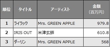 デジタルシングル(単曲)、デジタルアルバム、ストリーミングを合算した年間デジタル総売上金額では、Mrs. GREEN APPLEが100億円超えを記録し、2年連続で1位を獲得しました。デジタル売上が100億円を超えるのはオリコン史上初となります。中でもストリーミング年間1位となった『ライラック』は、2024年4月配信の楽曲ながら2025年に入ってから再生数を大きく伸ばし、年間を通じてヒットを記録しました。