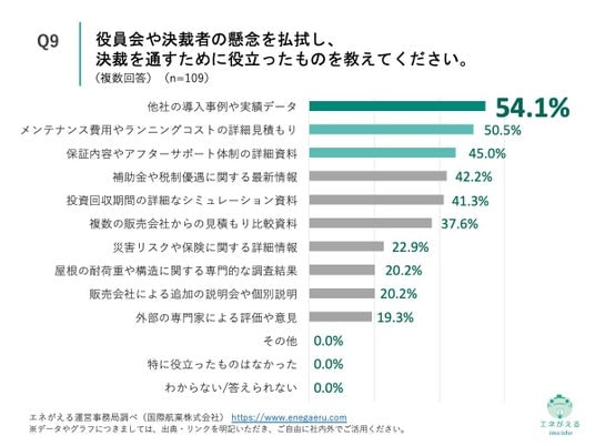 「Q9. Q8で「特にない」「わからない/答えられない」以外を回答した方にお聞きします。役員会や決裁者の懸念を払拭し、決裁を通すために役立ったものを教えてください。(複数回答)」(n=109)と質問したところ、「他社の導入事例や実績データ」が54.1%、「メンテナンス費用やランニングコストの詳細見積もり」が50.5%、「保証内容やアフターサポート体制の詳細資料」が45.0%という回答になりました。