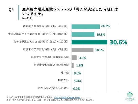 「Q5. 産業用太陽光発電システムの「導入が決定した時期」はいつですか。」(n=111)と質問したところ、「次年度予算に向けた検討時期(11月~1月頃)」が30.6%、「新年度予算の策定時期(4月~6月頃)」が24.3%、「中間決算に伴う予算の見直し時期(9月~10月頃)」が19.8%という回答になりました。