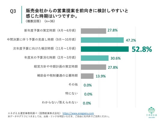 「Q3. Q2で「販売会社からの営業提案を受け、その後に社内検討を進めた」「自社での検討と、販売会社からの提案がほぼ同じ時期に進んだ」と回答した方にお聞きします。販売会社からの営業提案を前向きに検討しやすいと感じた時期はいつですか。(複数回答)」(n=36)と質問したところ、「次年度予算に向けた検討時期(11月~1月頃)」が52.8%、「中間決算に伴う予算の見直し時期(9月~10月頃)」が47.2%、「年度末の予算消化時期(2月~3月頃)」が30.6%という回答になりました。