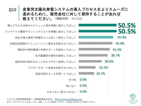 「Q10. 産業用太陽光発電システムの導入プロセスをよりスムーズに進めるために、販売会社に対して期待することがあれば教えてください。(複数回答)」(n=111)と質問したところ、「導入プロセス全体のスケジュール感を明確に提示してほしい」が50.5%、「メンテナンス費用やランニングコストを明確に提示してほしい」が50.5%、「他社の導入事例や実績をもっと詳しく提示してほしい」が45.9%という回答になりました。