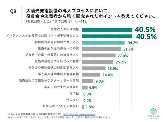 「Q8. 太陽光発電設備の導入プロセスにおいて、役員会や決裁者から強く懸念されたポイントを教えてください。(上位3つまで回答可)」(n=111)と質問したところ、「売電収入の不確実性」が40.5%、「メンテナンスや故障時の対応コストが不明確なこと」が40.5%、「初期投資の回収期間が長いこと」が34.2%という回答になりました。