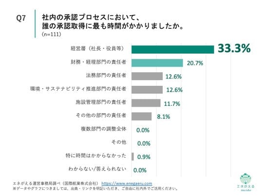 「Q7. 社内の承認プロセスにおいて、誰の承認取得に最も時間がかかりましたか。」(n=111)と質問したところ、「経営層(社長・役員等)」が33.3%、「財務・経理部門の責任者」が20.7%という回答になりました。