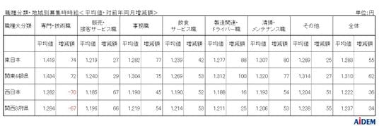職種大分類別の平均時給は、「専門・技術職」1,434円(前年同月比72円増)、「清掃・メンテナンス職」1,320円(同77円増)、「製造関連・ドライバー職」1,312円(同100円増)、「事務職」1,304円(同75円増)、「飲食サービス職」1,269円(同53円増)、「販売・接客サービス職」1,240円(同29円増)の順で、前年同月比で全ての職種がプラスとなった。都県別の平均時給は、東京都1,347円(前年同月比59円増)、神奈川県1,339円(同75円増)、千葉県1,255円(同74円増)、埼玉県1,247円(同65円増)の順となり、前年同月比で全ての都県がプラスとなった。西日本エリア全体の平均時給は、前年同月比36円増の1,222円