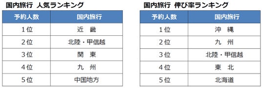 また、前年比の伸び率では、1位 沖縄、2位 九州、3位 北陸・甲信越となりました。沖縄は、個人旅行を中心に需要が増加しているほか、離島の周遊旅行も人気を集めています。北陸・甲信越は、予約数、伸び率ともに上位にランクインしました。同エリアでは、この時期限定の絶景「立山黒部アルペンルート 雪の大谷ウォーク」を目的とした旅行が好調に推移しています。