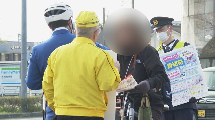 4月、警察が新潟市中央区の街頭で自転車の利用者に注意を呼びかけていた。