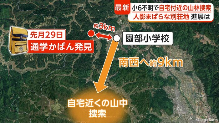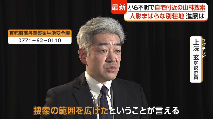 フジテレビ・上法玄解説委員は「捜索の範囲を広げたということが言える。行方に関する手がかりはまだ見いだせてないという状況が言える。彼の手がかりとなる情報、いなくなったところから捜索を広げたのか、裏山で日頃から遊んでいるとか、立ち寄った情報が寄せられたか、この2つが考えられる」と指摘している。