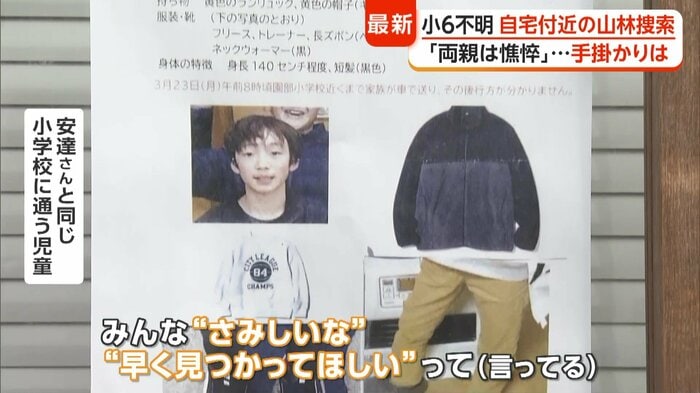 また、安達さんと同じ南丹市立園部小学校に通う児童は、安達さんについて「性格が良くて、とてもやさしい子。運動もできて、自分らしさが出せてる子。みんな“さみしいな”“早く見つかってほしい”って(言ってる)」と話す。