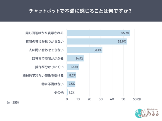 その結果、チャットボットを利用したことがある人の不満として「同じ回答ばかり表示される」が55.7%で最多となり