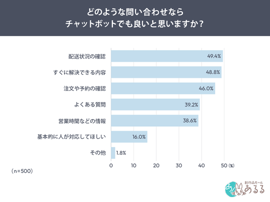 どのような問い合わせならチャットボットでも良いかを聞いたところ、「配送状況の確認」49.4%、「すぐに解決できる内容」48.8%、「注文や予約確認」46.0%が上位となりました。
