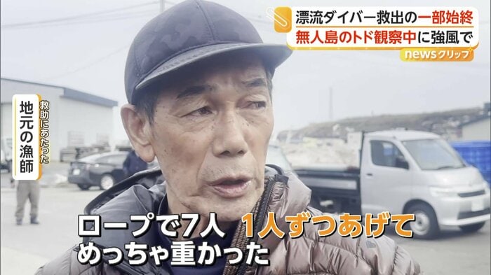 船が大きく揺れる中、3人がかりで1人ずつ引っ張り上げていき、ダイバー7人の救助に成功。