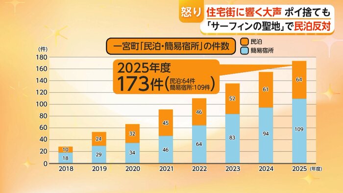 そんな一宮町の住宅街で今、管理者が常駐しない民泊や簡易宿所の数が年々急増。2025年度は173件(民泊64件、簡易宿所109件)と、2018年度の6倍以上の数になっている。