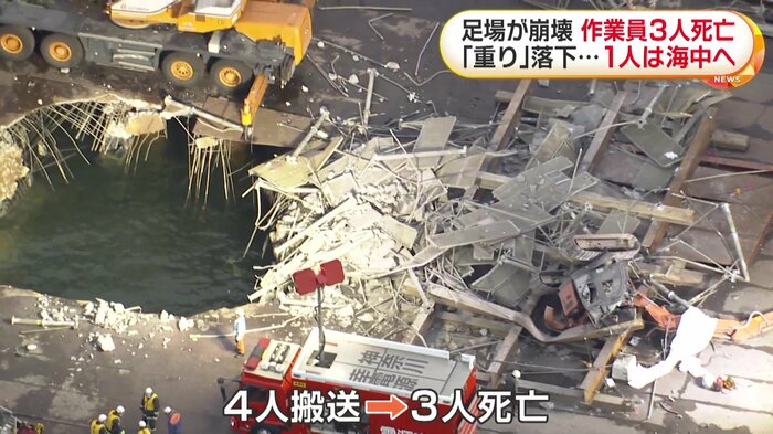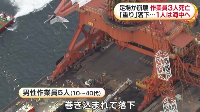 神奈川・川崎市で7日、クレーンの解体工事中に一部が落下して足場が崩れ、5人の男性作業員が巻き込まれて3人が死亡し、1人が海に落ちて行方不明になっている。