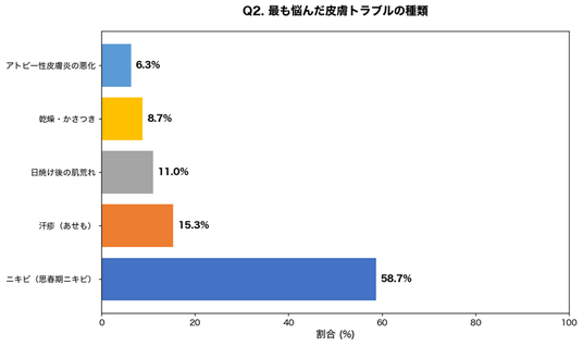 【調査結果】10代が最も悩む皮膚トラブルは「ニキビ」が58.7%で圧倒的多数