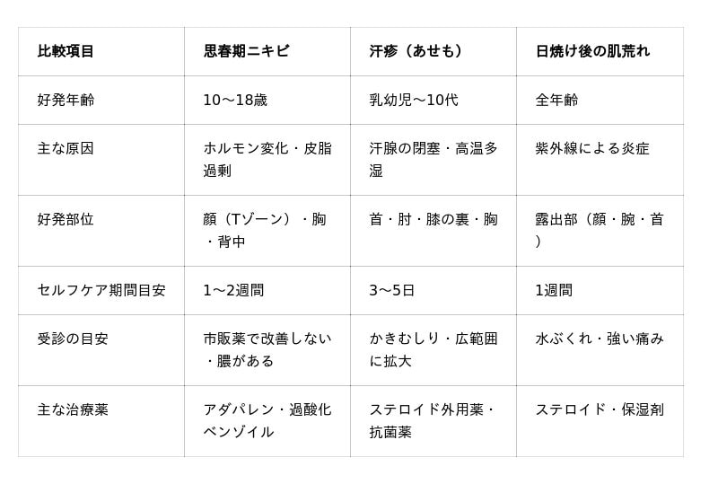 汗疹(あせも)については、通気性の良い衣類を着用し、汗をかいたらこまめに拭き取る・着替えることが基本です。ただし、かきむしって湿疹化した場合や、広範囲に拡大した場合は、二次感染のリスクがあるため皮膚科を受診してください。日焼け後の肌荒れについても、水ぶくれができた場合や強い痛みがある場合はII度熱傷の可能性があり、医療機関での処置が必要です。