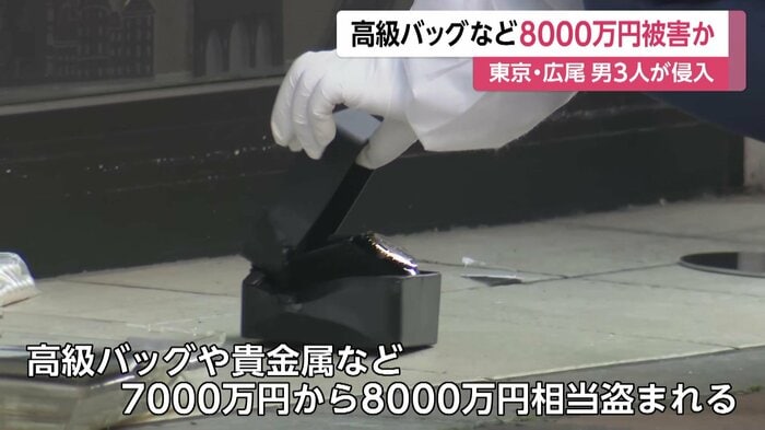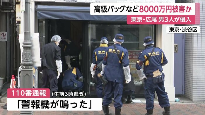東京・広尾のブランド品買取店に男3人が侵入し、貴金属など7000万円から8000万円相当を盗み逃走した。