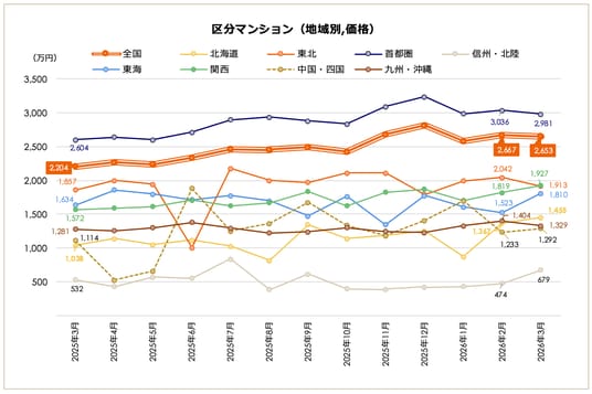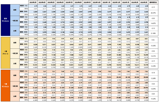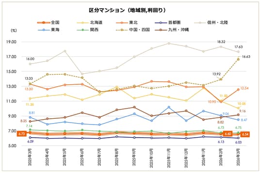 北海道(4,535万円)と関西(8,728万円)が直近1年間の最高値を更新し、前月比ではすべての地域で価格が上昇。前年同月比でも、多くの地域で価格は上昇した。利回りは前月比、前年同月比ともに、地域ごとにばらつきが見られたが、全体的には小幅な動きに留まった。