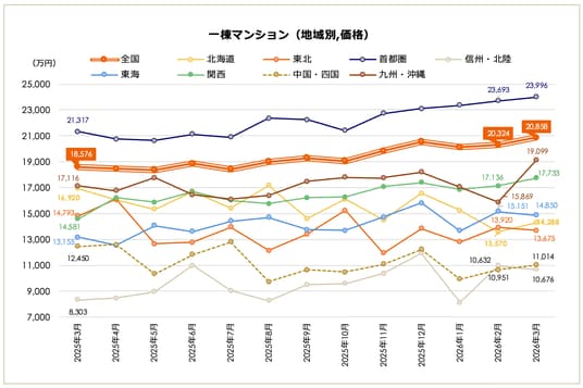 2026年3月期の一棟マンション市場は、全国平均価格が20,858万円で、2008年4月の集計開始以降の最高値を更新。前月比+2.63%、前年同月比では+12.28%となりました。全国平均利回りは7.36%で、前月比-0.04ポイント、前年同月比-0.18ポイントとなっています。